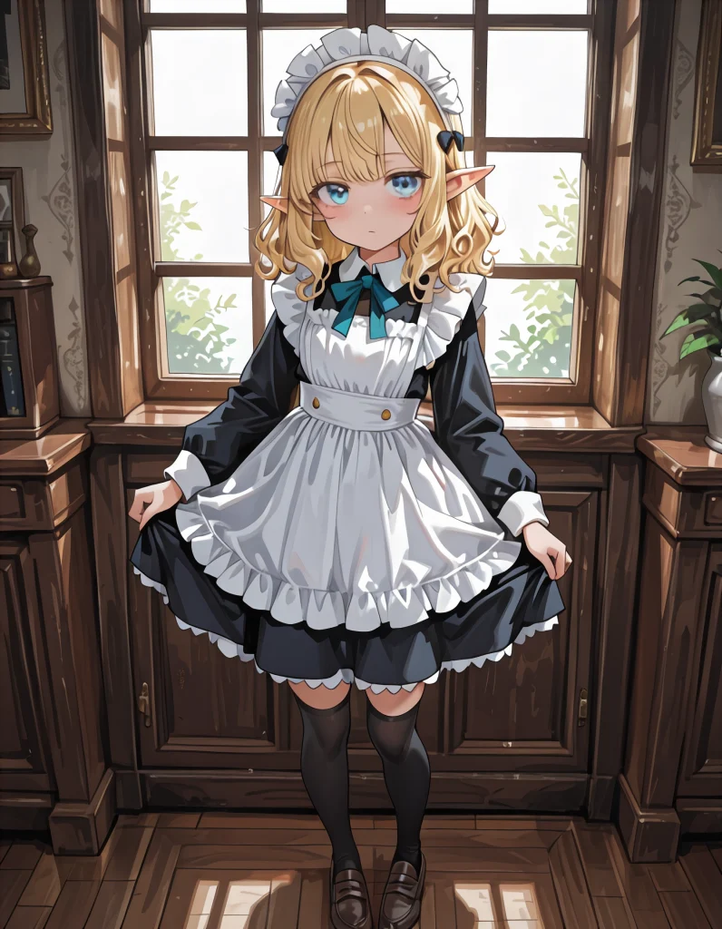 用意されたのは、可愛らしい黒と白のメイド服。 フリルのついたエプロン、短めのスカート、 胸元には小さなリボン。